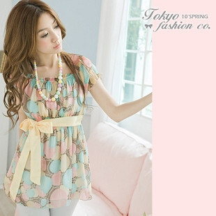 มาใหม่วันนี้ค่ะ Tokyo Fashion เสื้อผ้าแฟชั่นเกาหลีแขนตุ๊กตาผ้าชีฟองลายวงกลมโทนสีเขียวชมพูเหลืองติดริบบิ้นสีครีมผูกโบว์เอว