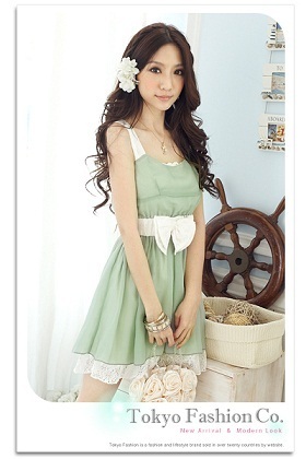 ใหม่ค่ะ !! Tokyo Fashion ชุดเดรสสายเดี่ยวผ้าชีฟองสีเขียวติดยางยืดเอว + เข็มขัดโบว์ผ้าลูกไม้ฉลุสีขาว