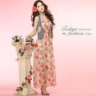 ใหม่ค่ะ !! Tokyo Fashion Maxi เดรสยาวสายเดี่ยวผ้าชีฟองสีเบจพิมพ์ลายดอกไม้สีแดงเขียวจับสม็อกช่วงอก