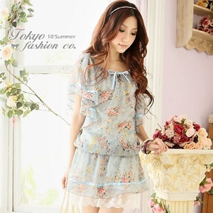 สินค้ามาใหม่วันนี้ค่ะ !! Tokyo Fashion เสื้อผ้าแฟชั่นเกาหลีแขนระบายผ้าชีฟองสีฟ้าลายดอกไม้สีชมพูเหลือง ติดยางยืดคอเสื้อและช่วงเอว