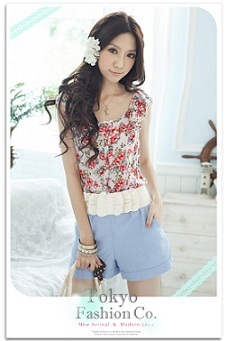 NEW !! Tokyo Fashion *พร้อมส่ง* เดรสกางเกงขาสั้นผ้าคอตตอนคอระบายสีเทาลายดอกไม้สีแดงตัดต่อกางเกงผ้าฝ้ายสีฟ้า