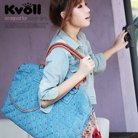 NEW !! Kvoll ** กระเป๋าแฟชั่นเกาหลีผ้ายีนส์สีน้ำเงินอ่อนแต่งลายตารางติดหมุดเงินสายหนังสีน้ำตาล