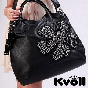 NEW !! Kvoll ** กระเป๋าแฟชั่นเกาหลีหนังสีดำ แต่งเพชรรูปโบว์ด้านหน้า