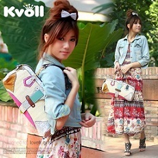 NEW !! Kvoll ** กระเป๋าแฟชั่นเกาหลีใบเล็กสีขาวแต่งผ้าสีน้ำตาลชมพูฟ้าสวยสดใสค่ะ