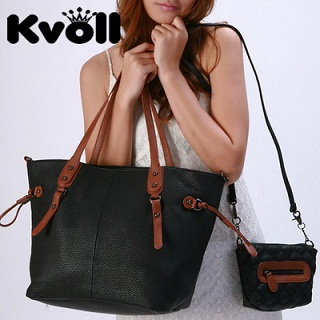 ขายส่ง Kvoll กระเป๋าแฟชั่นเกาหลีหนังสีดำสายสีน้ำตาล มีกระเป๋าเล็กให้ด้วยจ้า