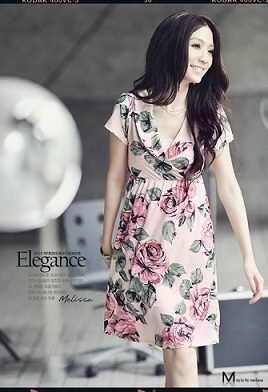 มาใหม่ค่ะ ! Tian-Mu ชุดเดรสแขนสั้นคอปกสีชมพูอ่อนพิมพ์ลายดอกกุหลาบสวยหวาน