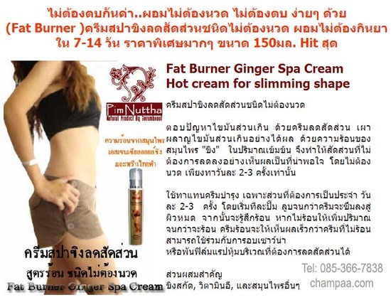 ตอบปัญหาไขมันส่วนเกิน ด้วยครีมลดสัดส่วน เผาผลาญไขมันส่วนเกินอย่างได้ผล ด้วยความร้อนของสมุนไพร "ขิง" ในปริมาณเข้มข้น จึงทำให้สัดส่วนที่ไม่ต้องการลดลงอย่างเห็นผลเป็นที่น่าพอใจ โดยไม่ต้องนวด เพียงทาวันละ 2-3 ครั้งเท่านั้น
