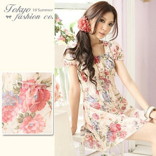 NEW !! Tokyo Fashion เสื้อตัวยาว/เดรสสั้นแขนตุ๊กตาสีครีมจับจีบย่นๆช่วงอกพิมพ์ลายดอกไม้โทนสีแดงน้ำเงิน