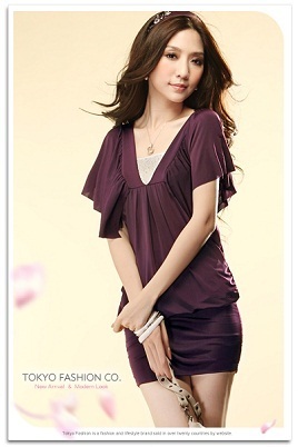 NEW Tokyo Fashion เสื้อตัวยาว/เดรสสั้นคอวีแขนระบายสีม่วง จั๊มเข้ารูปช่วงสะโพก