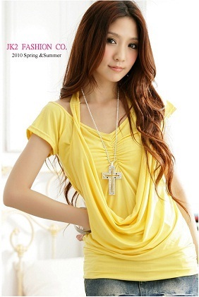 NEW JK2 เสื้อแขนสั้นสีเหลืองจับจีบย่นๆช่วงอก ตัดต่อให้เหมือนใส่เสื้อแบบคล้องคอตัวนอก