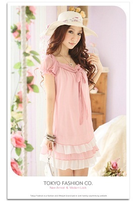 NEW จร้า Tokyo Fashion ชุดเดรสผ้าชีฟองแขนตุ๊กตาสีชมพู ผูกโบว์ช่วงอก ชายกระโปรงแต่งระบายสีขาว