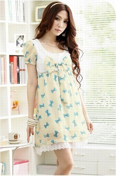 NEW !! JK2 ชุดแซกผ้าชีฟองแขนตุ๊กตาสีครีมจุดเหลือง แต่งลายโบว์สีฟ้า ช่วงอกเป็นผ้าลูกไม้สีขาว