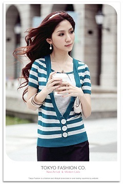 ขายส่ง ใหม่ Tokyo Fashion เสื้อแขนสั้นผ้า knit สีเทาลายทางเขียว ตัดต่อเหมือนใส่เสื้อตัวใน ติดกระดุมด้านล่าง