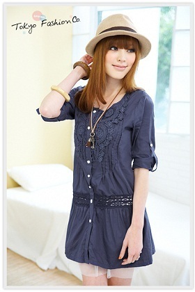 NEW !! Tokyo Fashion เสื้อแขนสามส่วนผ้าคอตตอนสีน้ำเงิน ติดกระดุมด้านหน้า แต่งลูกไม้ช่วงอกและเอว