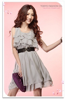 NEW !! Tokyo Fashion ชุดเดรสแขนกุดผ้าชีฟองสีเทา แต่งระบายชั้นๆช่วงอก ติดยางยืดเอว มีเข็มขัดให้ด้วยจ้า