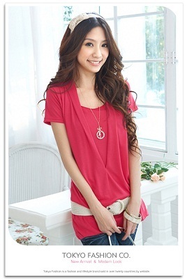 ขายส่ง Tokyo Fashion เสื้อยืดแขนสั้นสีชมพูเข้ม ดีไซน์เหมือนใส่เสื้อทับซ้อน