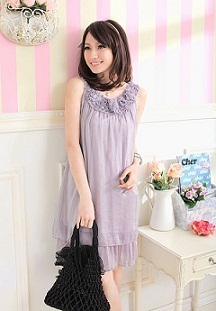 ขายส่ง LY ชุดเดรสแขนกุดผ้าชีฟองสีเทา แต่งดอกไม้รอบคอเสื้อ