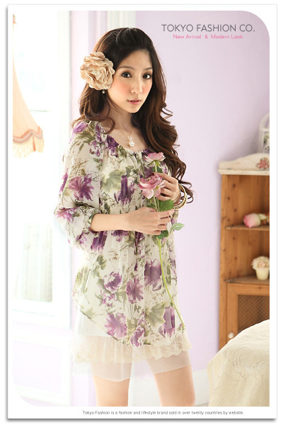 Tokyo Fashion เสื้อแขนสามส่วนผ้าชีฟองสีขาวลายดอกไม้สีม่วงเขียว ติดยางยืดที่คอและแขนสั้น