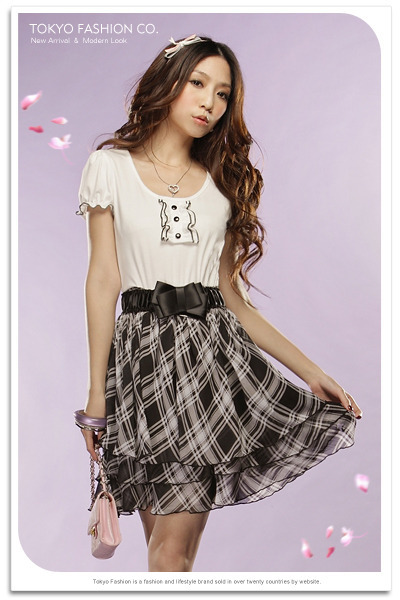 Tokyo Fashion ชุดเดรสเสื้อยืดแขนสั้นสีขาว แต่งกระดุมช่วงอก ตัดต่อกระโปรงลายสก็อตสีดำ มาพร้อมเข็มขัดให้ด้วยจ้า