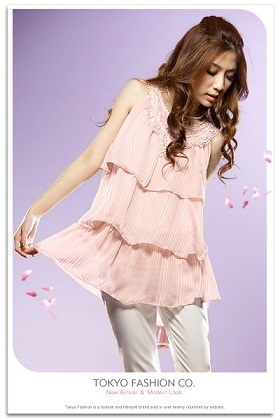 มาใหม่ Tokyo Fashion เสื้อแขนกุดผ้าชีฟองสีชมพู แต่งลูกไม้ที่คอเสื้อ