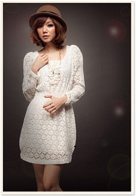 ชุดแซกแขนยาวสีขาว ตัวชุดเป็นผ้าลูกไม้ฉลุทั้งตัว แต่งระบายเล็กๆช่วงอก ติดยางยืดเอว