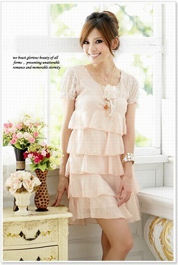 ขายส่ง JK2 ชุดเดรสแขนสั้นสีชมพู ช่วงตัวและแขนเสื้อแต่งผ้าลูกไม้แบบสาวหวาน ชายกระโปรงผ้าชีฟองมันวาวชั้นๆน่ารักค่ะ