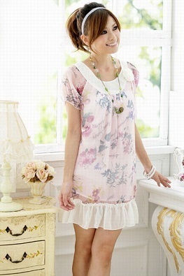 ขายส่ง JK2 ชุดเดรสผ้าชีฟองสีชมพู พิมพ์ลายดอกไม้สีม่วงเทา แต่งกุ๊นคอและติดดอกไม้สีขาว ชายกระโปรงมีระบายสีขาวค่ะ http://www.weloveshopping.com/template/w09/showproduct.php?pid=15842239&shopid=28677 Size : M