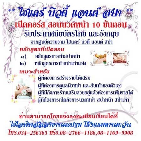 คอร์สนวดสปาหน้าใสยอดนิยม ... คอร์สนวดสปาหน้าใสระยะสั้น http://www.hilifeplusnp.com สามารถแจ้งลงทะเบียนเรียนได้ที่...