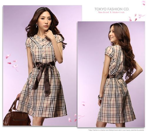 Mayuki ชุดเดรสคอจีนแขนสั้นผ้าคอตตอนลายสก็อตสีน้ำตาล ติดกระดุมช่วงอก มีริบบิ้นสีน้ำตาลคาดผูกเข้ารูปช่วงเอว สวยมั่กๆค๊า