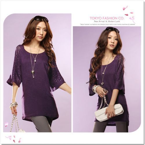 Tokyo Fashion เสื้อตัวยาวแขนสามส่วนผ้า knit เนื้อผ้าสีม่วง แต่งเลื่อมเพชรที่ช่วงแขนเพิ่มความสวยเก๋ค่ะ