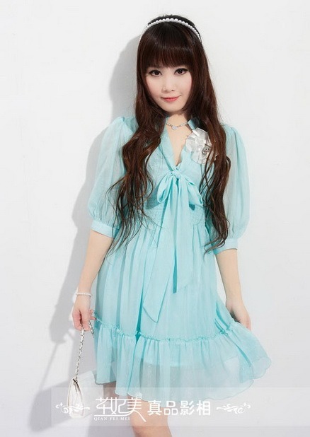 ชุดเดรสคอจีนแขนสามส่วนผ้าชีฟองสีฟ้า ผูกโบว์ที่ช่วงคอเสื้อ และจับสม็อกช่วงเอว ชายกระโปรงแต่งระบายสวยหวาน QFM http://www.weloveshopping.com/template/w09/showproduct.php?pid=15627935&shopid=28677 Size : M