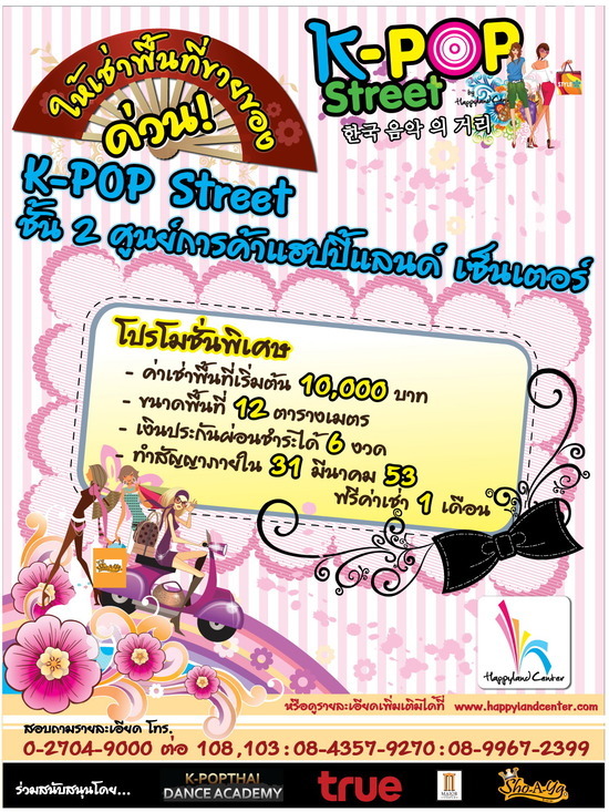 "ให้เช่าพื้นที่ขายของ สินค้าแนวแฟชั่นเกาหลี แนว K-Pop ในโซน K-POP Street ณ ศูนย์การค้าแฮปปี้แลนด์ เซ็นเตอร์ ชั้น2 โปรโมชั่นพิเศษ ลด 50% ระยะเวลา 6 เดือน - ค่าเช่าพื้นที่เริ่มต้น 10,000 บาท