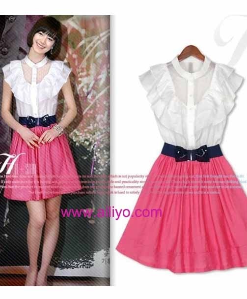 เสื้อผ้าแฟชั่นนำเข้าสไตล์เกาหลี : ชุดเดรสเสื้อสีขาว กระโปรงสีชมพู สไตล์เกาหลีน่ารักมากๆ