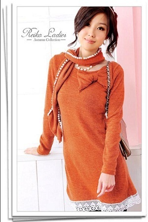 ชุดแซกสั้นหรือเสื้อตัวยาวผ้ายืดเนื้อนุ่มสีส้ม แต่งโบว์ที่ช่วงอก ต่อระบายลูกไม้สีขาวที่ชายเสื้อ มีผ้าพันคอให้เหมือนแบบ Brand JK2