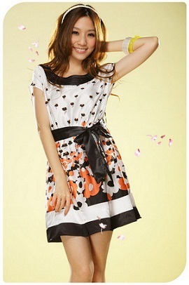 CL ชุดเดรสผ้าซาตินเนื้อมันสีขาวพิมพ์ลายดอกไม้สีส้ม แต่งกุ๊นสีดำ มีริบบิ้นคาดผูกโบว์ช่วงเอวด้วยจ้า http://www.bb-import.com/template/w09/showproduct.php?pid=15442731&shopid=28677 Size : M