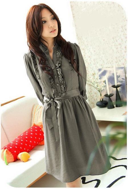 ดแซกคอจีนแขนสามส่วนสีเทา แต่งระบายและกระดุมที่ช่วงอก มีริบบิ้นคาดผูกเอวให้เหมือนแบบจ้า Brand ฮ่องกง JK2