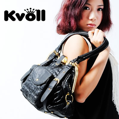 กระเป๋าสะพายหนังสีดำ แต่งเข็มขัดและมีช่องใส่ของด้านหน้า ที่ปิดกระเป๋าเป็นสีทองจ้า Brand เกาหลี Kvoll