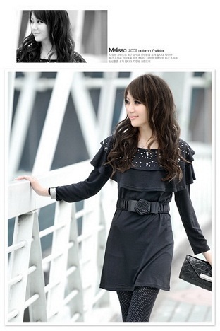 ชุดแซกสั้นหรือเสื้อตัวยาวสีดำ แต่งระบาย 2 ชั้นที่ช่วงอกและติดเลื่อมเม็ดเล็กๆเพิ่มความโดดเด่น (ไม่รวมเข็มขัดค่ะ) Tian-Mu