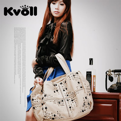 Sale !! กระเป๋าสะพายหนังสีขาวครีม แต่งหมุดสีดำและเงินรอบกระเป๋า มีซิปปิดด้านบน ใบโตจุของได้เยอะมากๆๆๆจ้า Brand เกาหลี Kvoll