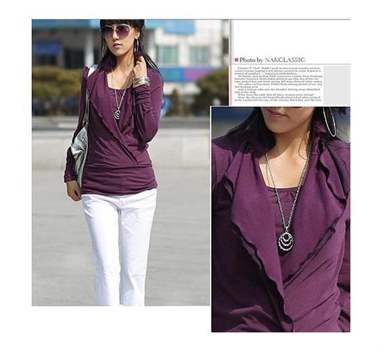 เสื้อยืดแขนยาวคอปกสีม่วง แต่งระบายเล็กๆที่ช่วงคอ ตัดต่อให้เหมือนใส่เสื้อตัวในด้วยค่ะ Brand SG Nest