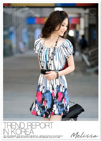 (ขายส่งเสื้อผ้าแฟชั่น 6 ชิ้น) ชุดแซกแขนตุ๊กตาสีขาว พิมพ์ลายโทนสีฟ้าแดง (ไม่รวมเข็มขัดค่ะ) Brand ไต้หวัน Tian-Mu