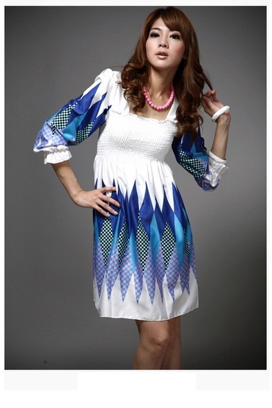 (ขายส่งเสื้อผ้าแฟชั่น 6 ชิ้น) ชุดเดรสแขนสามส่วนจับสม็อกที่ช่วงอก ตัวชุดพิมพ์ลายโทนสีน้ำเงิน มีซับในค่ะ Tang Chao
