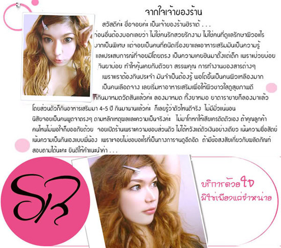 สวัสดีค่ะ ชื่อจอยค่ะ เป็นเจ้าของร้านชิราเต้.. ก่อนอื่นต้องบอกเลยว่า ไม่ใช่คนรักสวยรักงาม ไม่ใช่คนที่ดูแบรักษาผิวอะไรเป็นพิเศษ แต่จอยเป็นคนที่ถนัดเรื่องยาและอาหารเสริมมันเป็นความรู้และประสบการณ์ที่จอยมีโดยตรง เป็นความเคยชินมาตั้งแต่เด็ก เพราะป่วยบ่อย เลยกินยาบ่อย ทำให้คุ้นเคยกับตัวยา สรรพคุณ การทำงานของสารต่างๆ เพราะเราต้องกินประจำ มันจำเป็นต้องรู้ พอโตขึ้นเป็นคนผิวเหลืองมากเป็นคนเลือดจาง เลยเริ่มหาอาหารเสริมเผื่อให้ผิวขาวใสดูสุขภาพดี ก็กินมาหมดวัดสันแล้วค่ะ ลองมาหมด ทั้งยาหมด ยาดาราขายก็ลองมาแล้วโดยส่วนตัวก็กินอาหารเสริมมา 4-5 ปี กินมานานแล้วค่ะ ก็เลยรู้ว่าตัวไหนดีจริง ไม่มีมั่วแน่นอน นิสัยจอยเป็นคนพูดจาตรงๆ ตามหลักเหตุผลและความเป็นจริงค่ะ ไม่มาโกหกให้เสียเครดิตตัวเอง ถ้าคุณลูกค้าคนไหนไม่พอใจก็ขออภัยด้วย จอยเปิดร้านเพราะความชอบส่วนตัว ไม่ได้หวังแต่ตัวเงินอย่างเดียว เน้นความซื่อสัตย์ เน้นความเป็นกันเองแบบพี่น้อง เพราะจอยไม่ชอบอะไรที่เป็นทางการจนดูอึดอัด ถ้ามีข้อสงสัยเกี่ยวกับผลิตภัณฑ์ สอบถามได้นะค่ะ ยินดีให้คำแนะนำค่า...