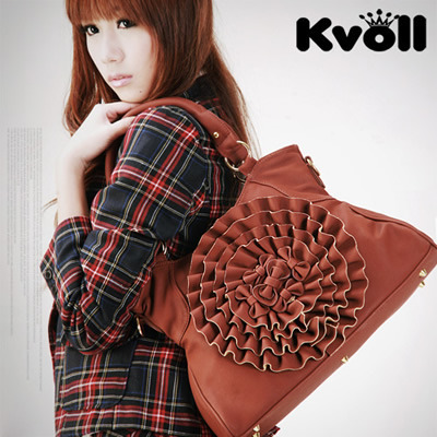 กระเป๋าสะพายหนังด้านสีน้ำตาลส้ม แต่งดอกไม้ด้านหน้า สวยมากมายจ้า Brand เกาหลี Kvoll