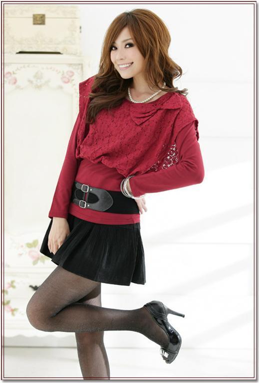 (ขายส่ง 6 ชิ้นคละแบบได้ค่ะ) เสื้อยืดแขนยาวสีแดง แต่งลูกไม้สีดำที่ช่วงตัว ติดโบว์ลูกไม้ที่ช่วงอกค่ะ Brand JK2