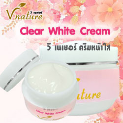 Clear White Cream ครีมหน้าใส ครีมหน้าใสที่ขจัดความหมองคล้ำจุดด่างดำด้วยเทคโนโลยีจากอเมริกาและ สารสกัดจากลูกพีชและราสเบอรี่ ช่วยในการผลัดผิวเก่า ลดเลือนจุดด่างดำต่างๆ ให้ค่อยๆจางลงเผยผิวใหม่ให้ขาว ผิวเริ่มเผยผิวขาวใสภายใน 7 วัน วิตามิย E ช่วยบำรุงผิวให้เนียนนุ่มชุ่มชื้นและกระชับรูขุมขนให้เล็กลงอย่างเห็นได้ชัด