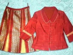 เสื้อ รอบอกประมาณ 37 นิ้ว ปักที่ปลายแขนทั้ง 2 ข้าง กระโปรง ยาว 25 นิ้ว รอบเอว 29 นิ้ว แยกเกล็ดรอบตัวและแทรกผ้าไหม + ผ้ายก สีในรูปจะดูสดกว่าของจริง
