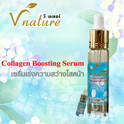 V Nature Collagen Boosting Serum Collagen มีอนุภาคเล็กจิ๋วแต่แจ๋ว ซึ่งทำให้ผิวสามารถดูดซึมได้ล้ำลึก เหมือนการฉีด Collagen ช่วยให้การปฏิบัติงานของ Collagen เต็มประสิทธิภาพ ตรงเข้าบำรุงและลดเลือนริ้วรอย ให้ผิวแข็งแรง กระชับเต่งตึง กระตุ้นการสร้าง collagen และ elastin ให้กับผิวหน้า ทำให้ผิวหน้าแลดูอ่อนกว่าวัย ผสมผสานกับวิตามินซี ช่วยยับยั้งการเกิดเม็ดสีเมลานิน ทำให้ผิวหน้าขาวสว่างใส เรียบเนียน ช่วยให้ริ้วรอยลึกค่อยๆตื้นขึ้น อย่างเห็นได้ชัด เนื้อเซรั่มบางเบาซึมซาบสู่ชั้นใต้ผิวในระดับ DNA ได้เป็นอย่างดี