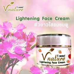 V Nature Lightening Face Cream ครีมที่ช่วยให้บอกลาความขาวซีดๆ มาเป็นขาวใสอมชมพูเหมือนเด็ก ด้วยการคิดค้นผนึกกำลังของสารสกัดที่เข้มข้นไม่เหมือนใคร ของสตรอเบอรี่และเชอร์รี่ ซึ่งมีวิตามินสูงกว่าสารสกัดจากส้มถึง 50 เท่า เนื้อครีมเข้มข้น เข้าดูแลแก้ปัญหาความหมองคล้ำไม่สดใสได้อย่างตรงจุด ช่วยให้รูขุมขนเล็กลง ผิวหน้าเรียบเนียนยิ่งขึ้น