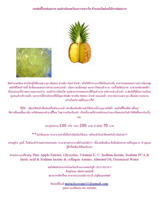 เจลขัดขี้ไคลสับปะรด เผยผิวเนียนพร้อมความขาวใส ด้วยเอนไซม์ผลไม้จากสับปะรด สินค้ายอดนิยม ส่วนใหญ่ใช้ขัดเฉพาะจุด (ข้อศอก ขาหนีบ รักแร้ หัวเข่า หรือใช้ทั่วร่างกายได้เป็นอย่างดี) สามารถทดสอบความขาวเนียนนุ่มหลังใช้ได้แล้ววันนี้ อีกขั้นตอนของการทำความสะอาดผิว เน้นความเนียนนุ่ม และขาวใสของผิวกาย เอนไซม์สับปะรด จะช่วยผลัดเซลล์ผิวชั้นนอกออกไป ลดความหยาบกร้าน เผยผิวขาวเนียนใส คุณสามารถทดลองทาที่มือแล้วนวด หลังจากล้างน้ำแล้ว จะสัมผัสได้ถึงความเนียนนุ่มของผิวบริเวณนั้น นอกจากนี้สำหรับคนที่มีปัญหาข้อพับ ขาหนีบ ข้อศอก หัวเข่า หมองคล้ำ สามารถทาเฉพาะจุด เพื่อลดความหยาบกร้านในบริเวณที่ต้องการได้ วิธีใช้ : เพียงใช้กับผิวที่แห้งยังไม่ต้องอาบน้ำ ตักเพียงนิดเดียวแล้วใช้ปลายนิ้วหมุนวนให้ทั่ว จนเกิดขี้ไคลสีดำๆขึ้นมา สีดำๆที่ลอยขึ้นมานั่น จะมีลักษณะคล้ายๆขี้ไคล ในความเป็นจริงแล้ว เป็นเนื้อเจลที่ช่วยผลักและม้วนเอาสิ่งสกปรกในผิวให้ติดขึ้นมากับเนื้อเจล กระปุกขนาด 100 กรัม ราคา 250 บาท ค่าจัดส่ง 70 บาท **อย่าลืมนะคะ ทาบางๆเท่านั้นไม่จำเป็นต้องใช้เยอะ เสร็จแล้วก็อย่าลืมสครับผิวกันต่อค่ะ** เศรษฐกิจ ยุคนี้...ไม่ต้องเข้าร้านสปากันหรอกค่ะ เรามาทำสปาง่ายๆที่บ้านกันดีกว่า เนื้อเจลสีเหลือง มีกลิ่นสับปะรด แต่ไม่ฉุนมาก ผิวนุ่มจนรู้สึกได้เพียงใช้ในครั้งแรก ส่วนประกอบที่สำคัญ: Pine Apple Extract, Glycerine, Vitamin E, C, Sodium lactate, Sodium PCA & lactic acid & Sodium lactate & collagen Amino, Almond Oil, Deionized Water